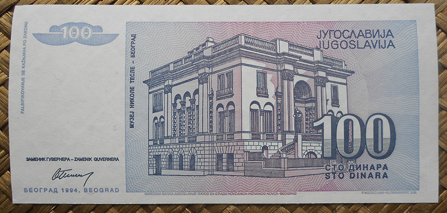 El billete de 100 dinares de Yugoslavia de 1994 nos muestra en el anverso la imagen de un Nikola Tesla más maduro, junto al anagrama del Banco Nacional “Narodna Banka Yugoslavije”. En el reverso veremos de nuevo el edificio del Museo Tesla en Belgrado. Su marca de agua, una sencilla filigrana romboidal.