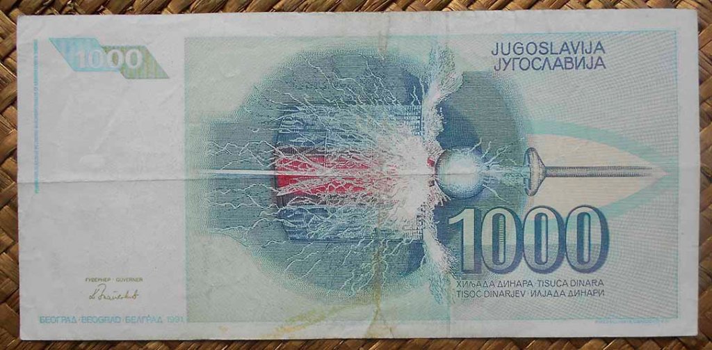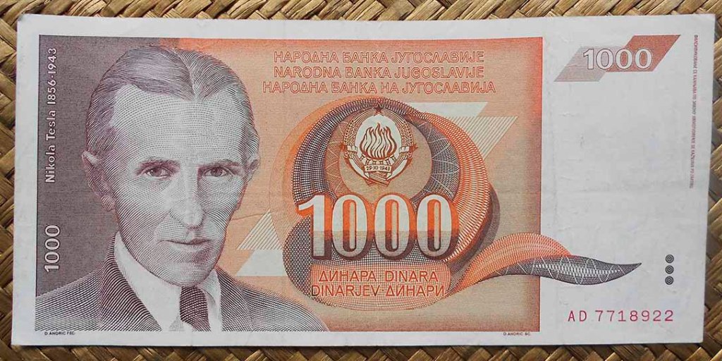 El billete de 1000 dinares de Yugoslavia de 1990 nos ofrece en su anverso al Nikola Tesla envejecido; junto a él el emblema del AVNOJ (Consejo Antifascista de Liberación Nacional de Yugoslavia) y a la postre escudo de la RFSY –República Socialista Federativa de Yugoslavia, con la fecha de su segundo congreso en Jajce, el 29 de noviembre de 1943, donde Tito se reunió con las fuerzas aliadas para hablar de la liberación yugoslava tras la WWII. El reverso nos dibuja verticalmente la bobina de Tesla y los arcos eléctricos que genera. Su cromaticidad, predominantemente naranja. Su marca de agua, el rostro de Nikola Tesla maduro.
