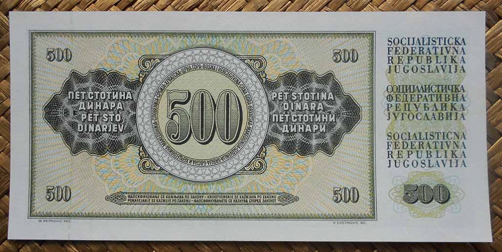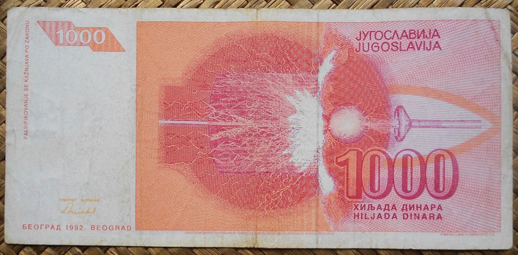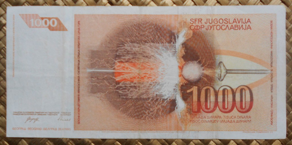 El billete de 1000 dinares de Yugoslavia de 1992 es como los dos anteriores, pero actualiza el logo que acompaña en el anverso a Tesla, cambiando el del AVNOJ por el anagrama del Banco Nacional “Narodna Banka Yugoslavije”. En cuanto a su cromaticidad de impresión, es rosa anaranjada.