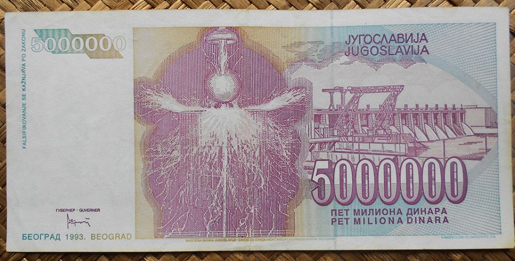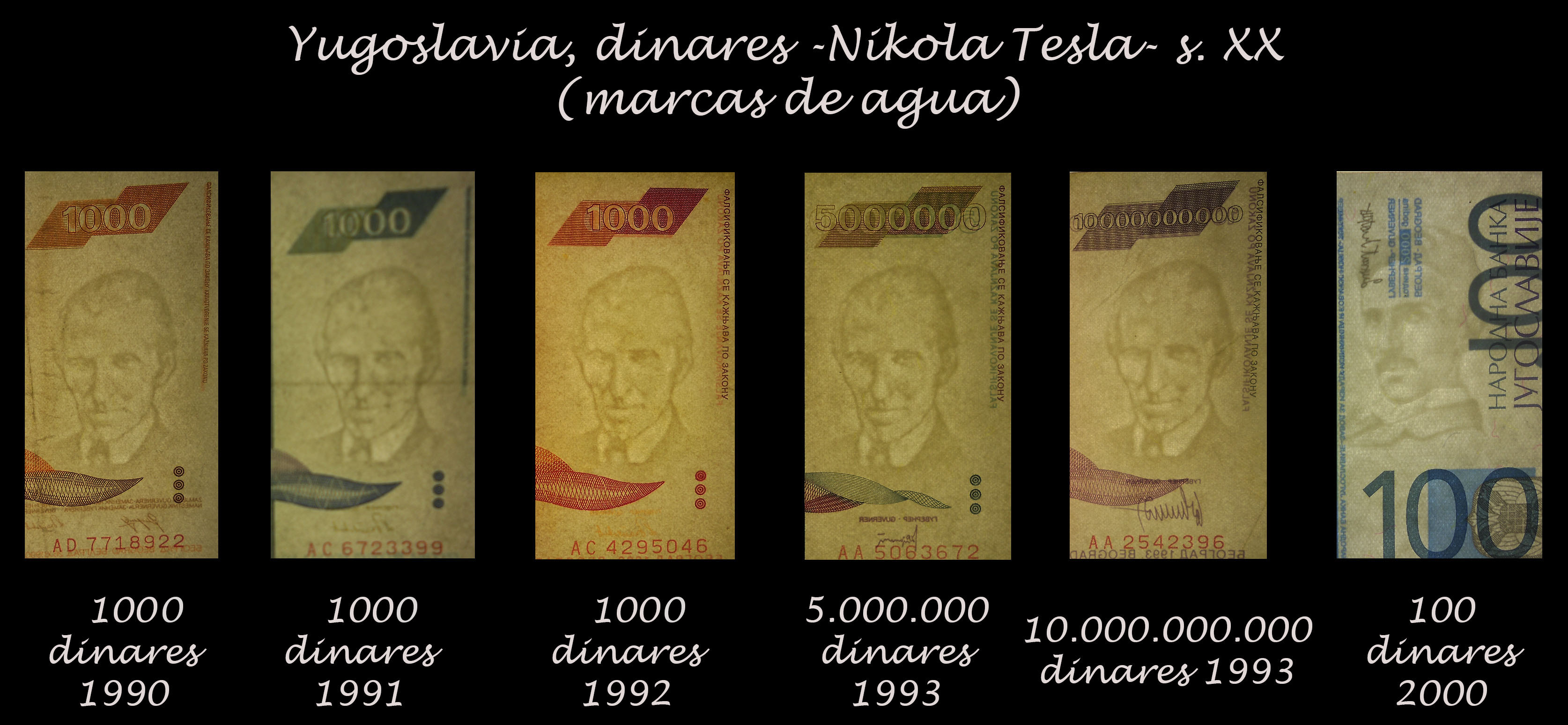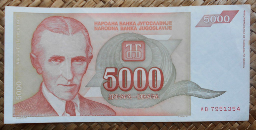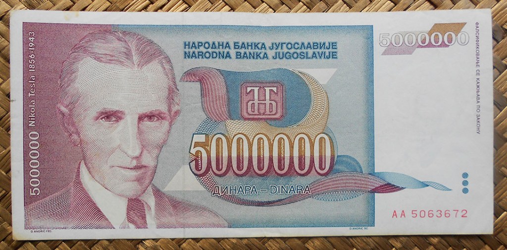 El billete de 5.000.000 dinares de Yugoslavia de 1993 nos ofrece en el anverso al Tesla maduro con el anagrama del Banco y en el reverso la bobina de Tesla junto a una presa de una central hidroeléctrica. Cromaticidades moradas y azuladas. Su marca de agua, el rostro de Nikola Tesla maduro. Uno de los ejemplares salidos de la hiperinflación que sufrió el país antes de su desmembración.