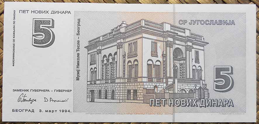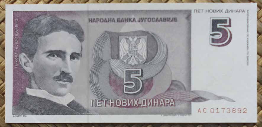 El billete de 5 nuevos dinares de Yugoslavia de 1994 nos ofrece en el anverso la imagen de un joven Tesla junto al escudo de armas yugoslavo. En su reverso contemplamos una vista lateral del edificio que alberga el Museo Tesla en Belgrado. Su marca de agua, una sencilla filigrana romboidal.
