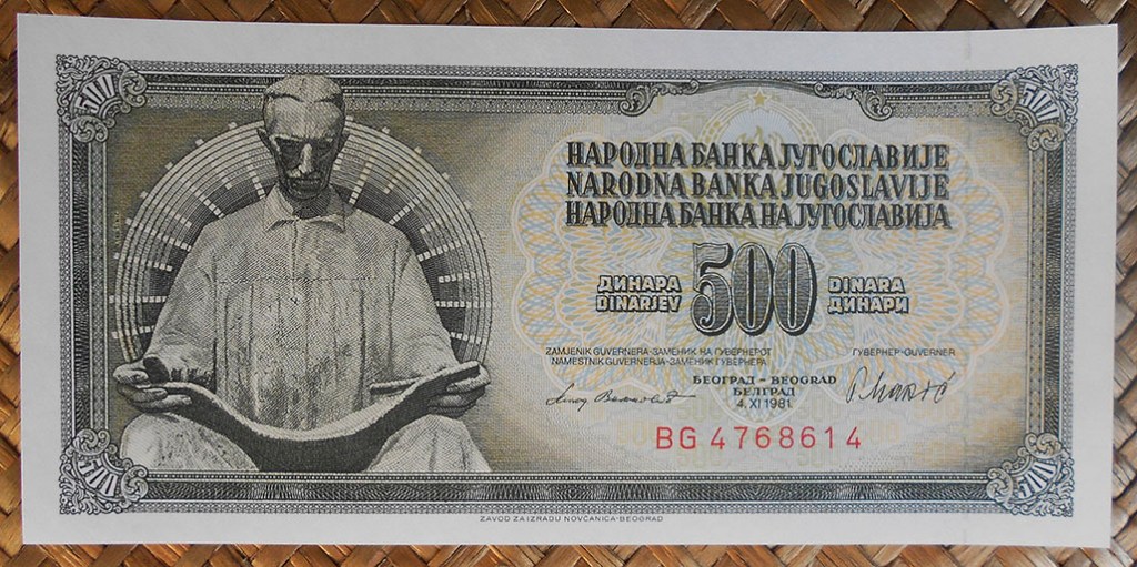 El billete de 500 dinares de Yugoslavia de 1981 nos trae en su anverso a Tesla en uno de los muchos monumentos repartidos por el mundo (Belgrado, Niágara, Nueva York, …) que lo muestran sentado leyendo un libro, abierto entre sus manos. Su reverso es para una recreación de cicloides y rosetas con el valor del billete y textos en serbocroata y ruso. Sin marca de agua.
