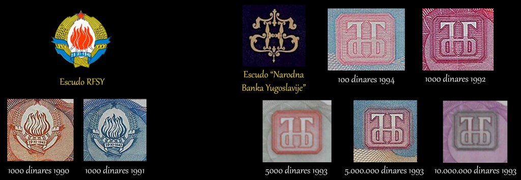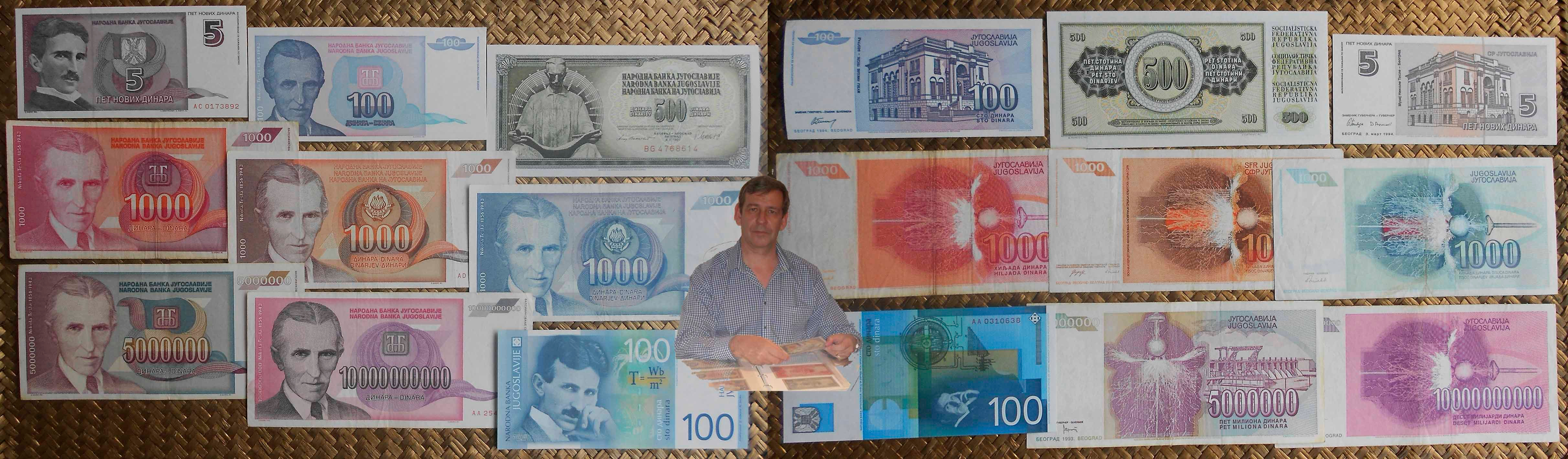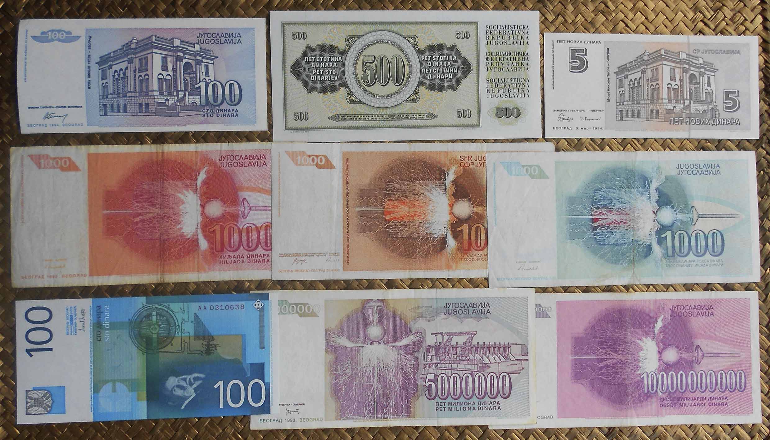 Contemplemos los billetes de 5 dinares de Yugoslavia de 1994, 100 dinares de 1994 y de 2000, 500 dinares de 1981, 1.000 dinares de 1990, 1991 y 1992, 5.000 dinares de 1993, 5.000.000 dinares de 1993 y 10.000.000.000 dinares de 1993.