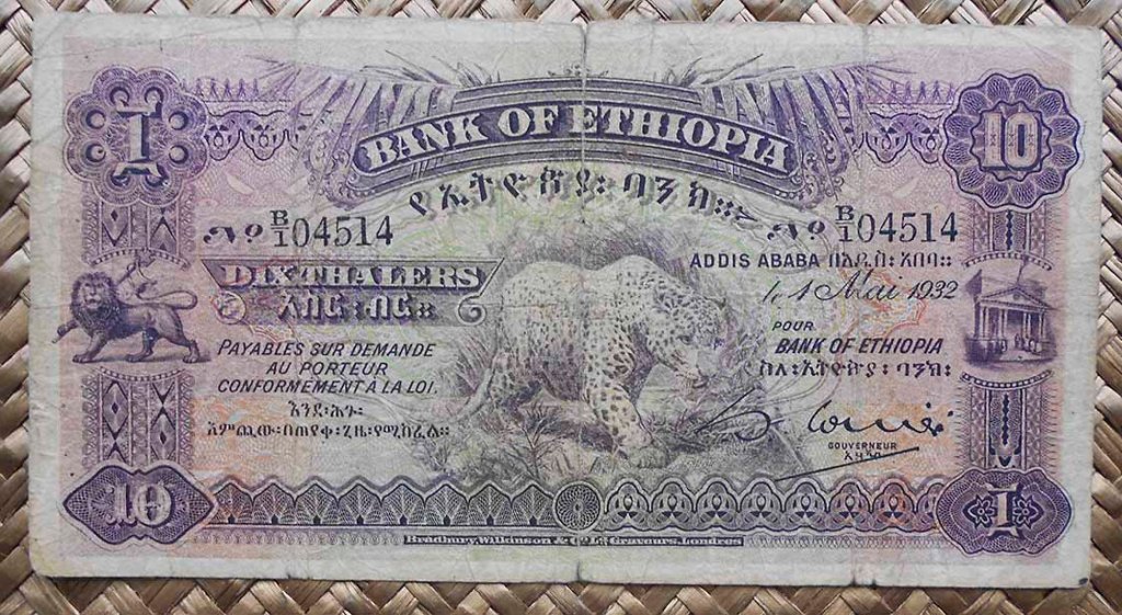 El billete de 10 thalers de Etiopía de 1932 nos presenta en su anverso al leopardo y esta vez los grabados del león andante y el edificio de entrada del Banco intercambian su posición respecto al de 5 thalers, apareciendo el emblema imperial a la izquierda y la entrada columnada del Banco a la derecha. Para el reverso otra artística composición simétrica de rosetas, cicloides y hojas de palmera, pero con el valor en número del billete a ambos lados, dejando el centro para el cartucho con el nombre del Banco en amhárico.