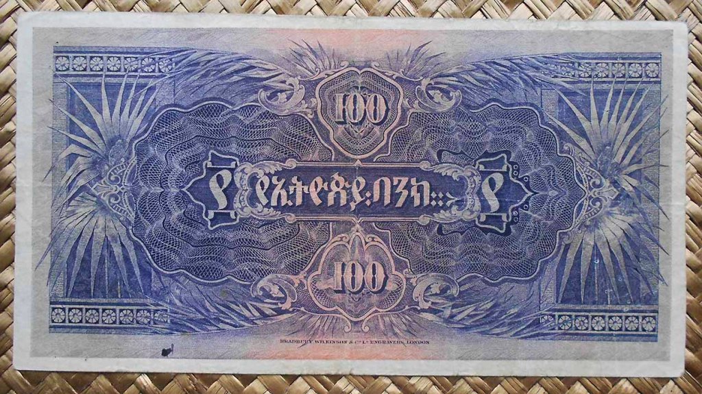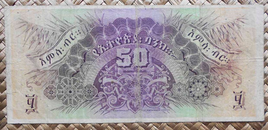 El billete de 50 thalers de Etiopía de 1932 nos seduce con el rey de la selva, un magnífico león al centro con los detalles león andante y entrada columnada del Banco a derecha e izquierda del mismo. En el reverso, sobre un manto de rosetas, figuras simétricas y guilloches interminables, el valor del billete al centro y textos solo en amhérico sobre él y a sus lados. Tonalidad predominante marrón y lila en grabados sobre fondos de colores cálidos.