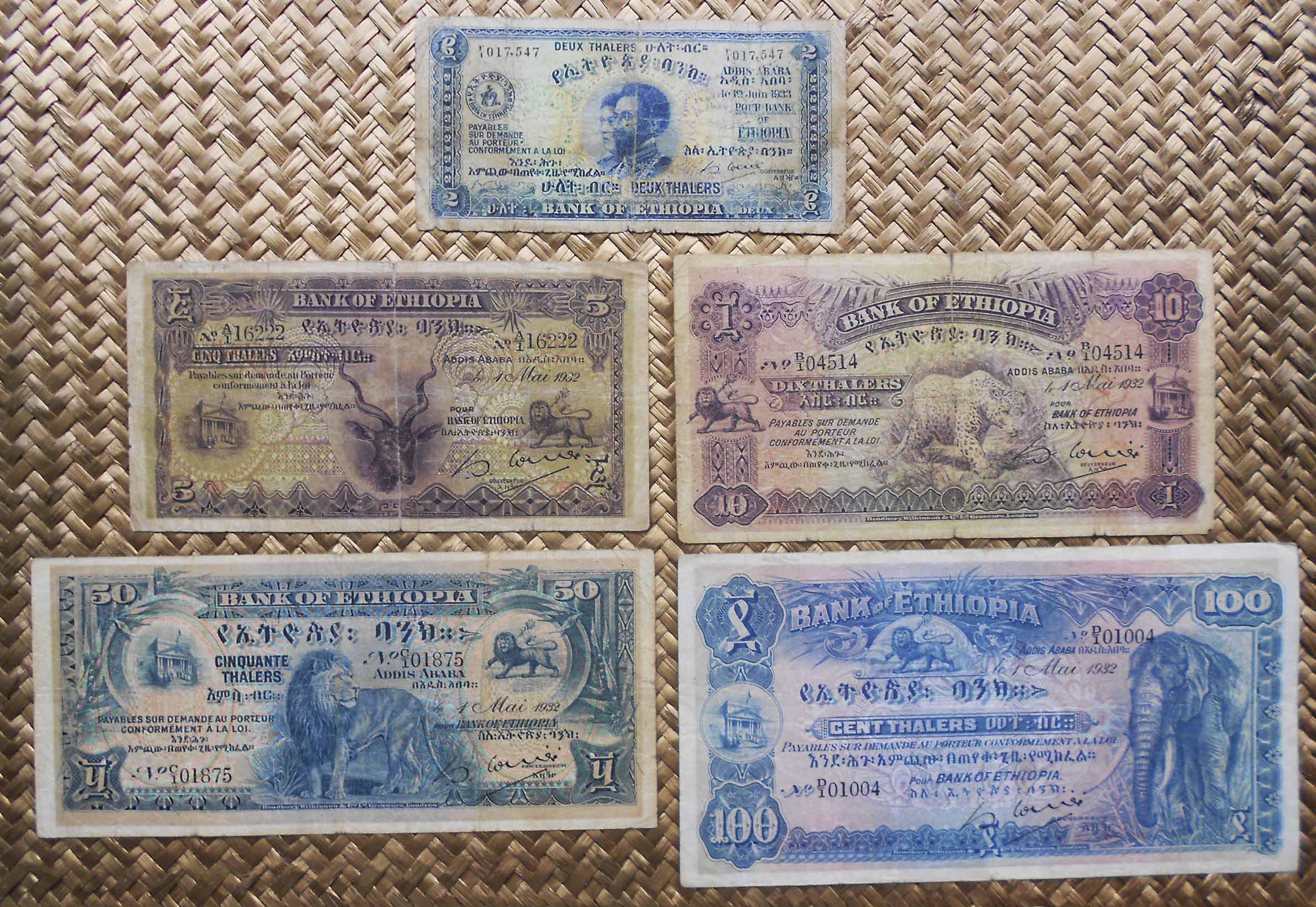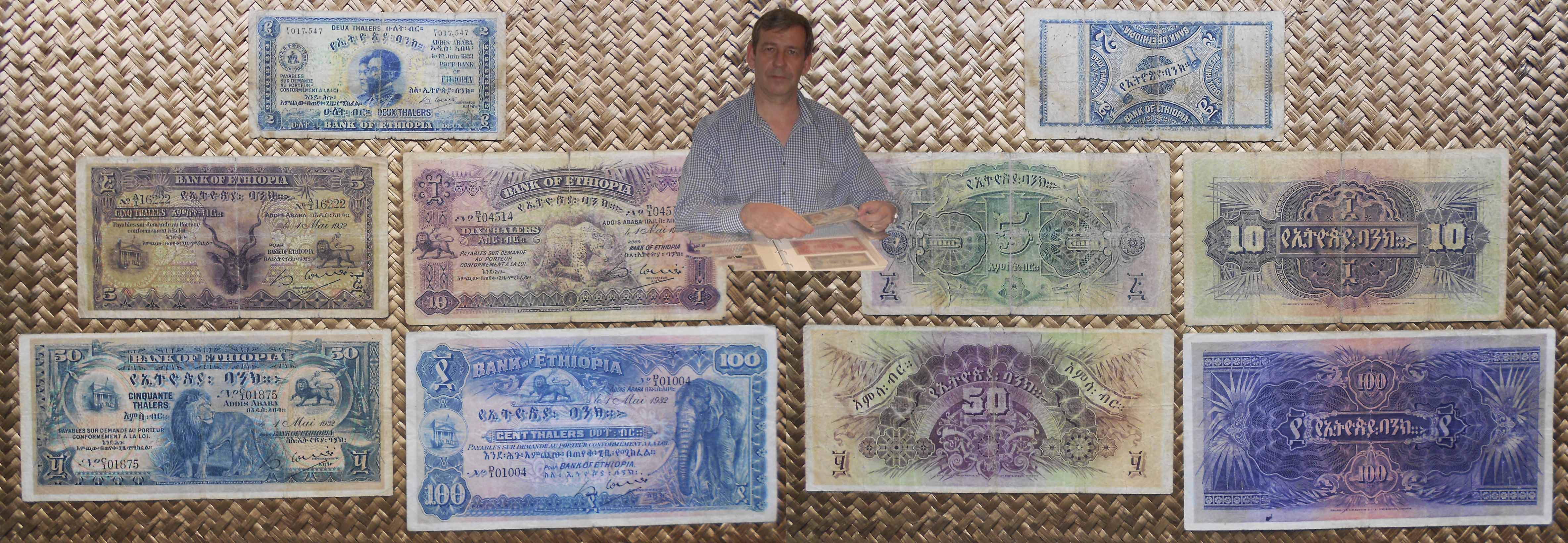 En 1932 y bajo el reinado de Haile Selassie se editó una de las series africanas más bonitas. Impresa por Bradbury, Wilkinsons & Co. de Londres se emitieron ejemplares de 2, 5, 10, 50 100 y 500 thalers.