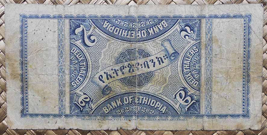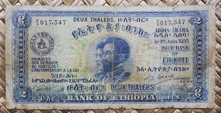 El más pequeño de la serie, de 2 thalers, nos ofrece en sus grabados a los emperadores Haile Selassie y Menen Asfaw en un disco central, escoltados a los lados por extraordinarias rosetas y cicloides de colores cálidos que dan luminosidad al marco azulado que rodea el anverso. El reverso, ya todo en tonos azules, nos ofrece un montaje simétrico de guilloches en torno al cartucho central que incluye el nombre del Banco en amhárico.