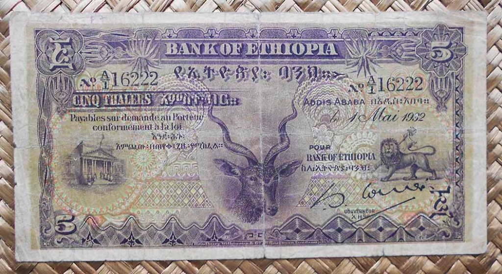 El billete de 5 thalers de Etiopía de 1932 está presidido en su anverso por la cabeza de una gacela. A su derecha el emblema imperial con un león andante sujetando con una garra una cruz procesional con un serpentín a su alrededor. A su izquierda, vista de la entrada del edificio del Banco de Etiopía de la época, en Adis Abeba. El resto del anverso resalta iluminado con rosetas y ciclóides de colores cálidos que rompen la oscuridad del marco, esta vez de color marrón. Su reverso, esta vez con grabados verdosos con contraste de amarillos y lilas, vuelve a sorprendernos con unos estilizados cicloides, rosetas, discos y cartuchos con palmas vegetales alrededor del valor del billete, en número, en posición central y con una composición simétrica a su alrededor.