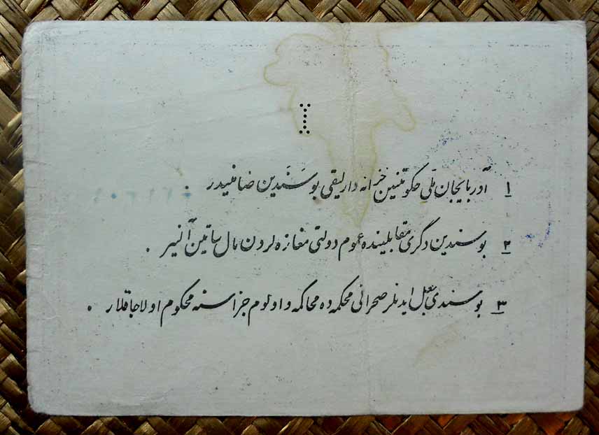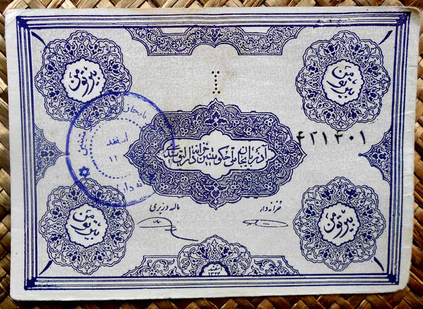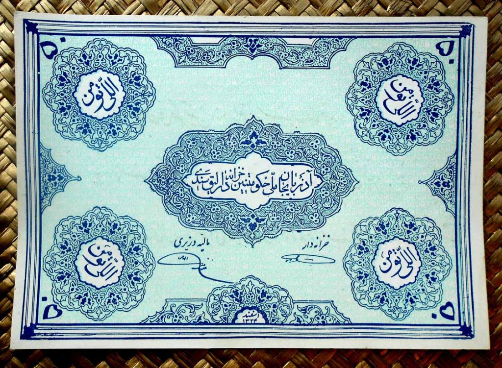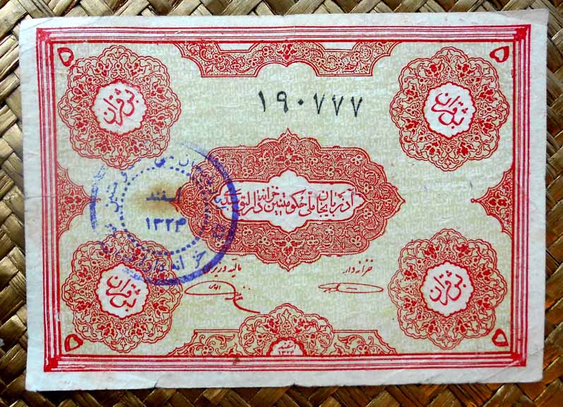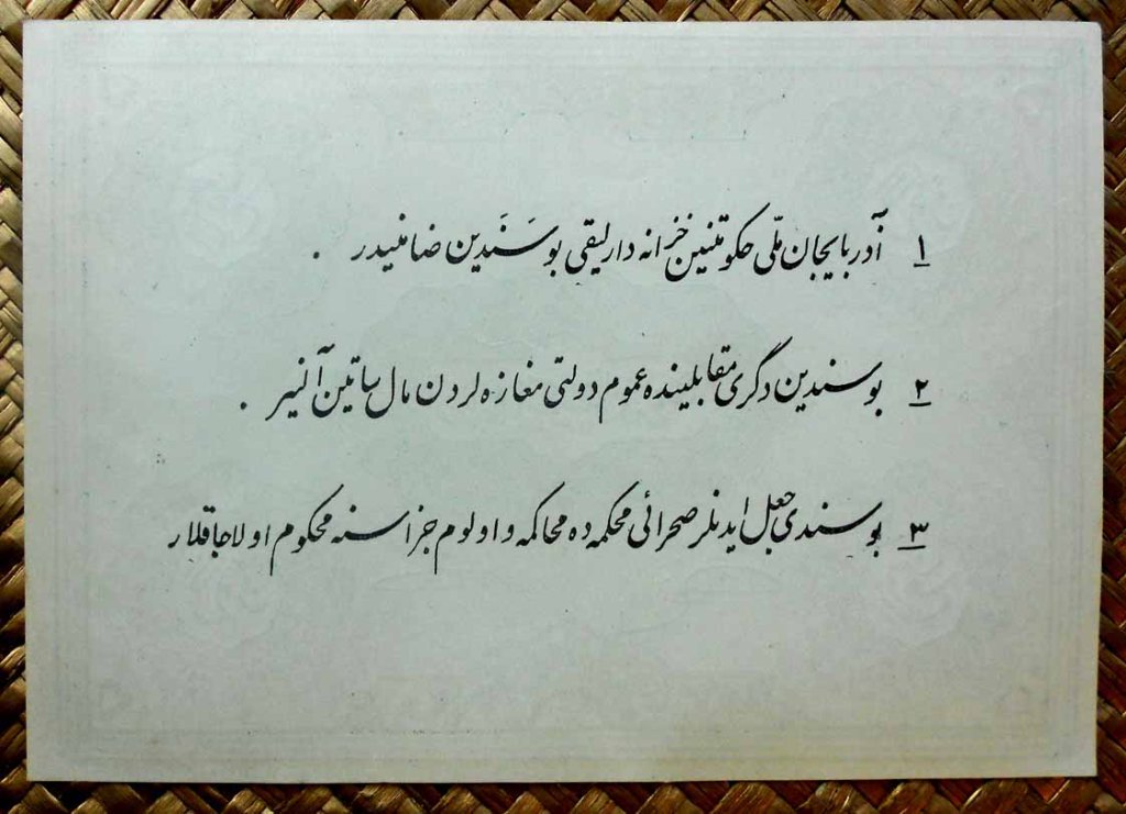 En sus anversos sus valores, en texto y número, en cada esquina sobre arabescos. En el centro del billete “El Tesoro del Partido Democrático de Azerbaiyán”. Al pie las firmas del Tesorero y del Ministro de Finanzas. Los textos aparecen en persa.