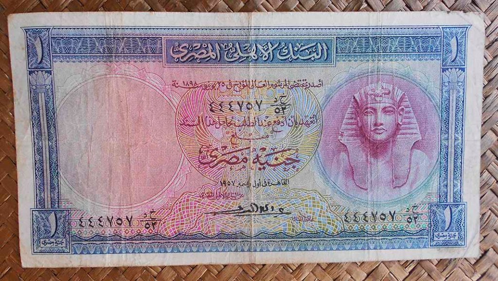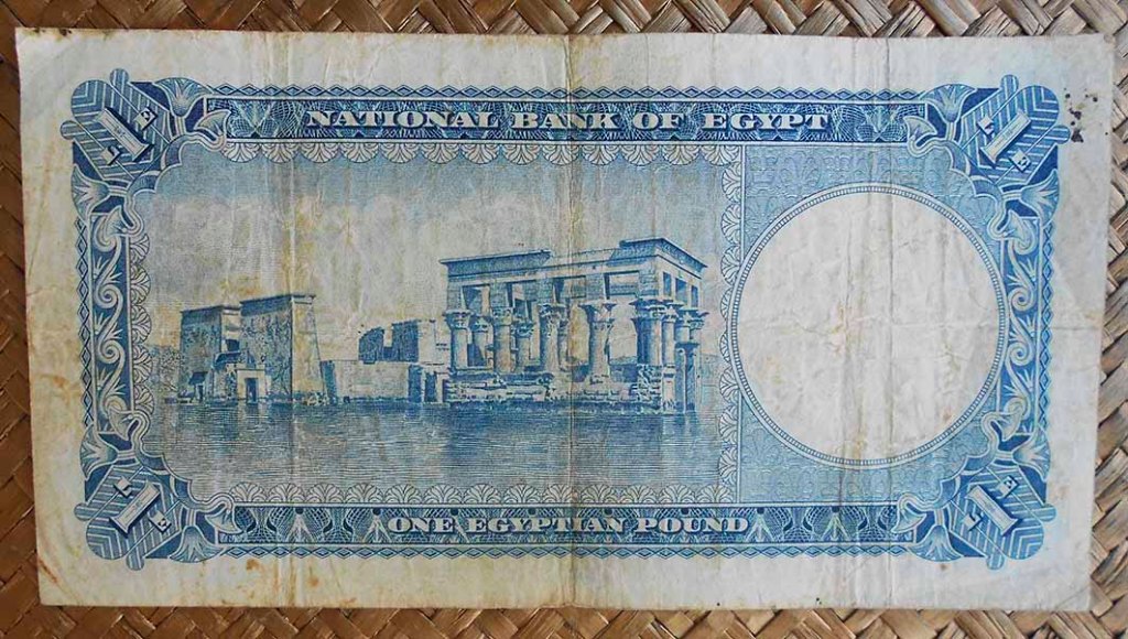 El billete de 1 libra de Egipto de 1957 nos ofrece en anverso a Tutankhamon y al reverso imágenes del Templo de Isis y el Kiosko de Trajano en la isla de Philae, trasladados a Agilkia tras la construcción de la presa de Asuán y el lago Nasser (años ’60 s. XX).