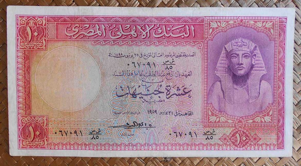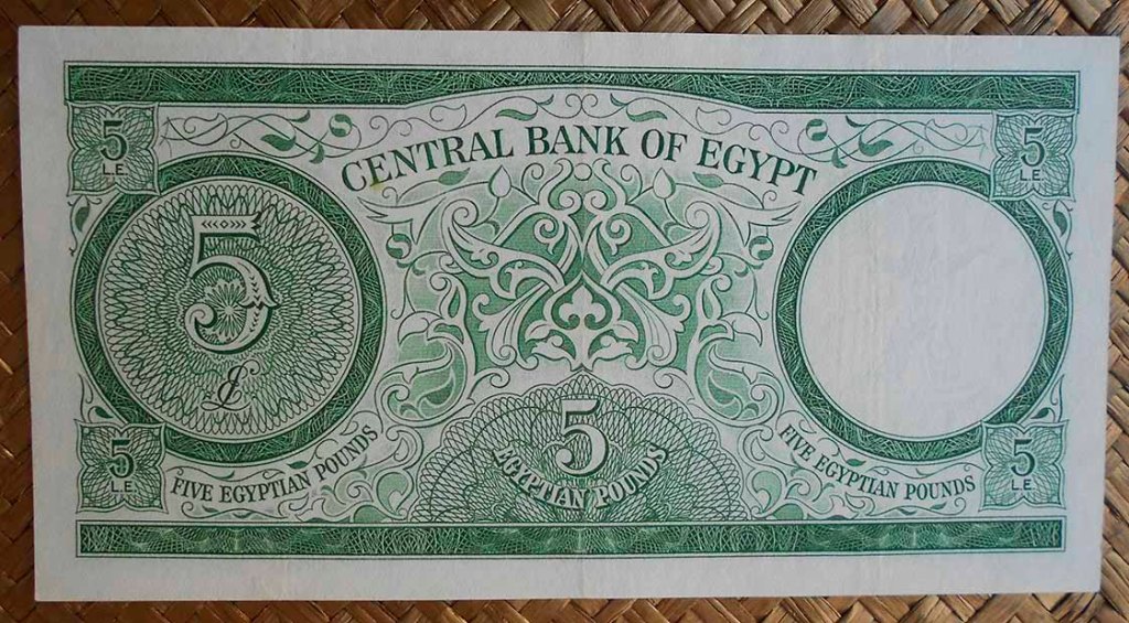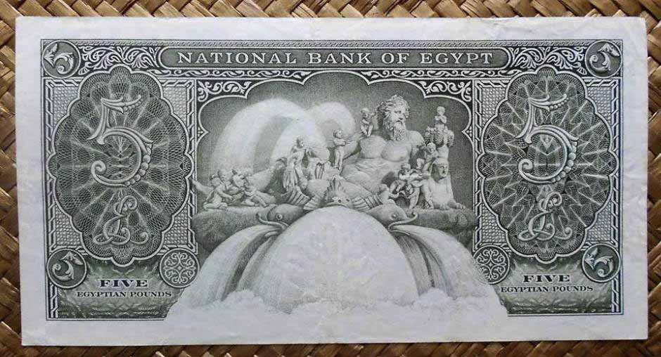 El billete de 5 libras de Egipto de 1959 nos representa en su anverso izquierdo una imagen de la Ciudadela de El Cairo, también conocida como Ciudadela de Saladino (por ser quien la mandó fortificar entre 1176 y 1183). Al reverso, grabado de una escultura (que se exhibe en el museo Pio-Clementino del Vaticano) representando al dios Poseidón (griego), Neptuno (romano) o quizás Proteo (dios del mar proveniente de Alejandría y servidor de Poseidón), junto a una esfinge y rodeado de querubines.