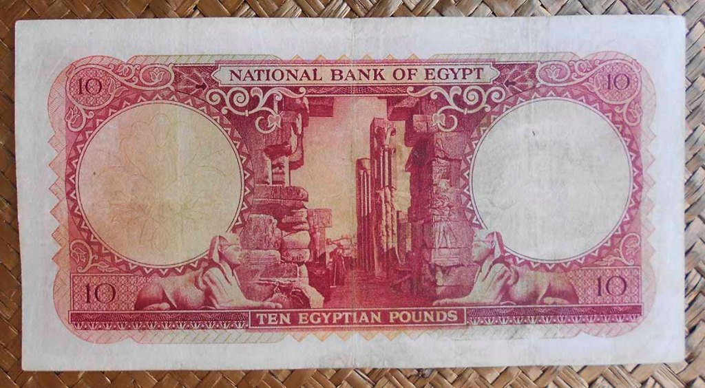 El billete de 10 libras de Egipto de 1959 nos ofrece a Tutankhamon en el anverso y un grabado de las ruinas del Templo de Karnak en Luxor entre dos enfinges (de las que “montan guardia” en la avenida homónima a la entrada del Templo dedicado al dios Amon-Ra) en el reverso.