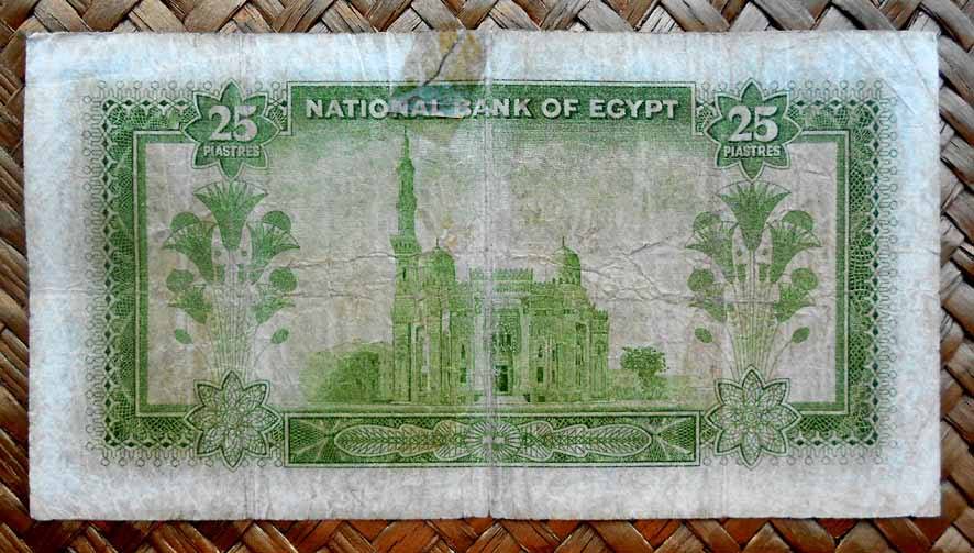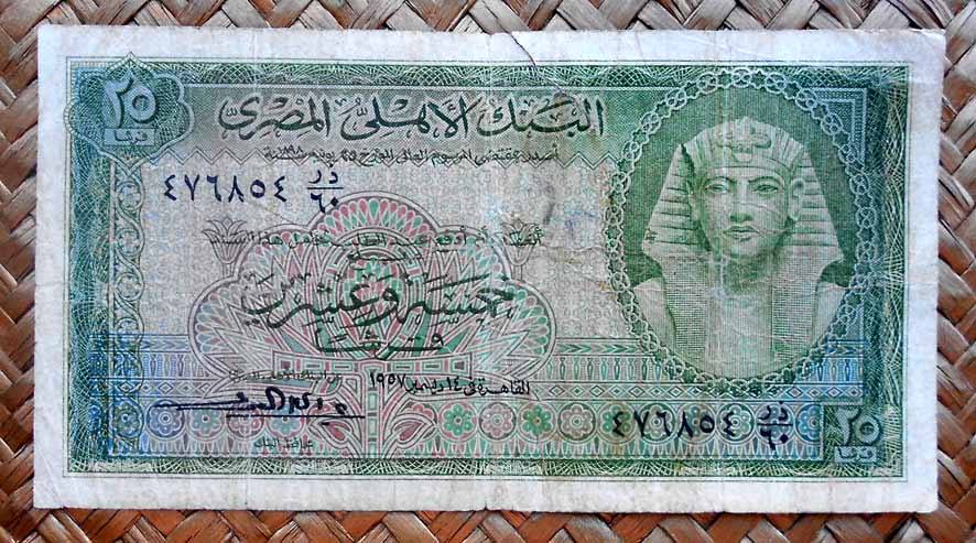 El billete de 25 piastras de Egipto de 1957 nos muestra en su anverso a Tutankhamon y en el reverso la Mezquita de Abdoul Abbas de Alejandría entre flores de loto.