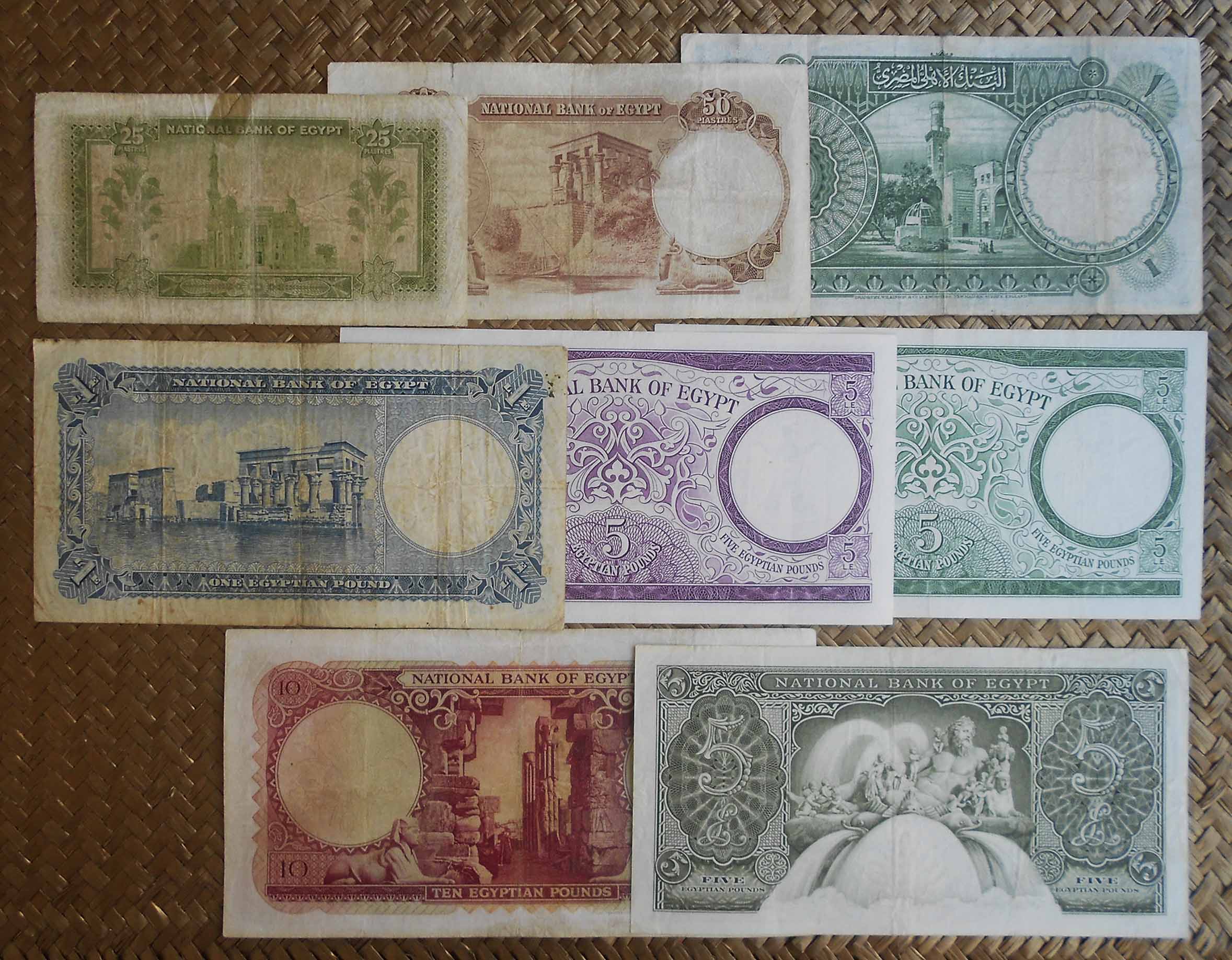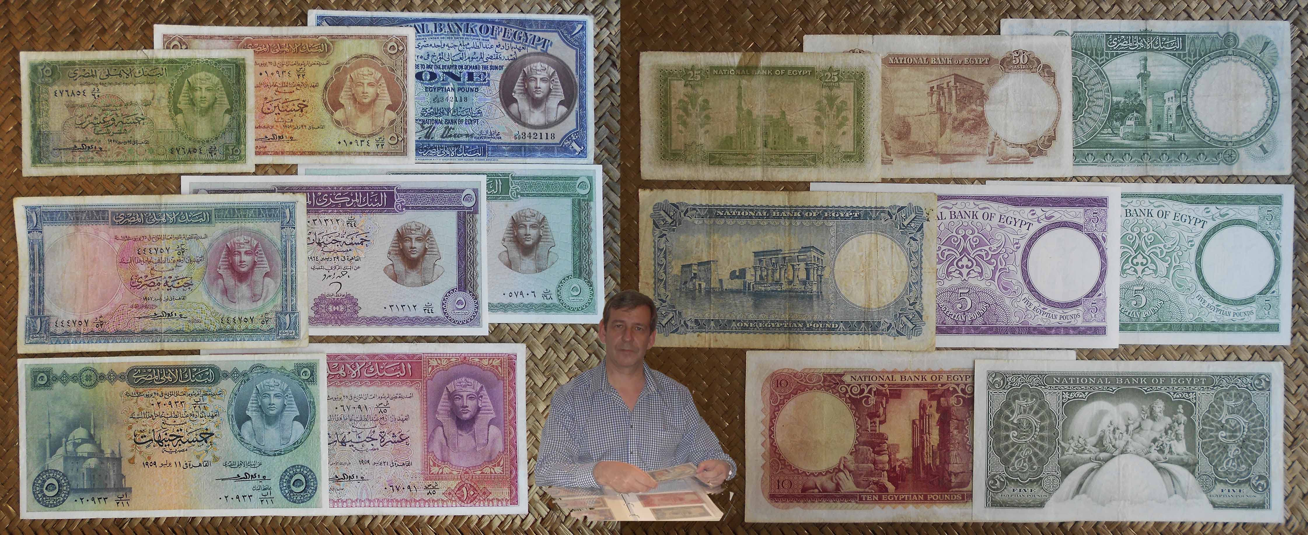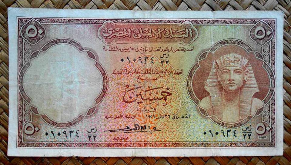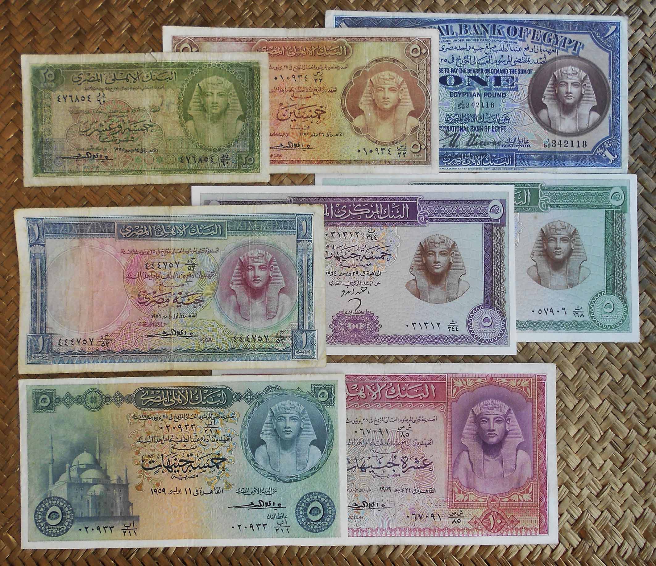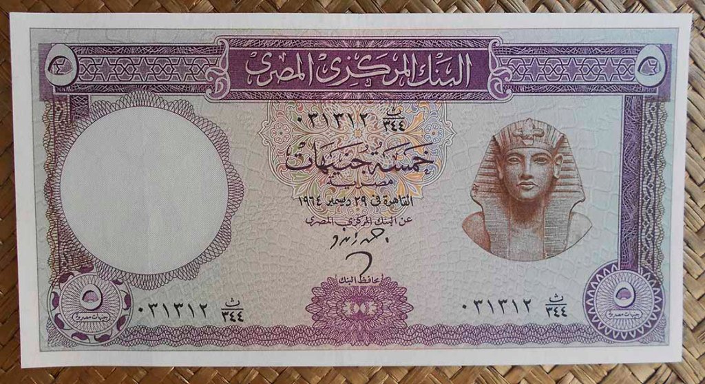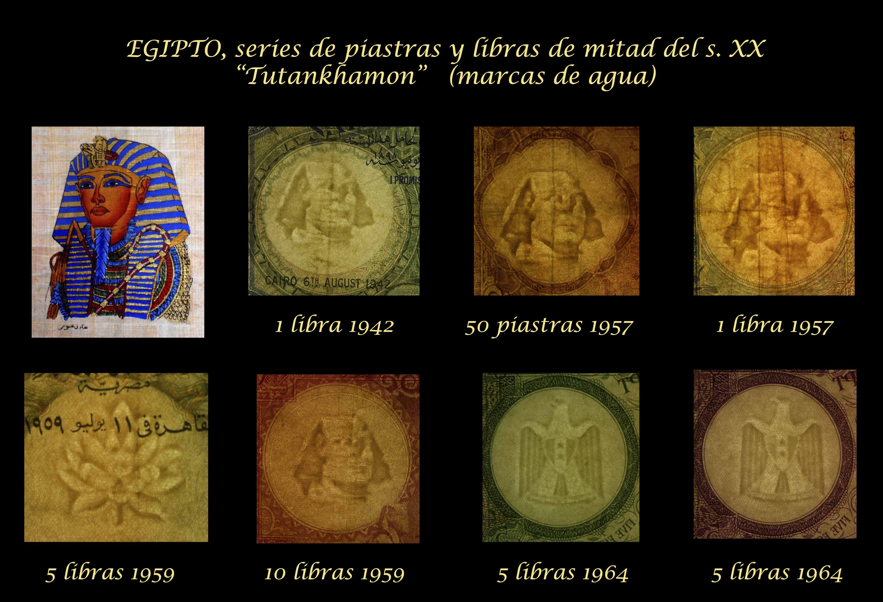 Contemplamos los billetes de Egipto de 25 piastras (pk WPM 28 sign.3), 50 piastras (pk. 29 sign.3), 1 libra de 1942 (pk.22c) y de 1957 (pk. 30 sign.3), 5 libras de 1959 (pk. 31 sign.3), 5 libras de 1964 (pk.39 y pk.40) y 10 libras de 1959 (pk. 32 sign.3). Todos ellos nos ofrecen a la derecha de sus anversos la efigie del faraón Tutankhamon. Textos y números de sus valores en árabe. Solo el billete de 5 libras de 1959 comparte anverso con un grabado de la Mezquita de Mohammed Ali en El Cairo y expone textos y numeración bilingüe (inglés y árabe).