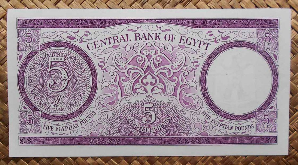 Los billetes de 5 libras de Egipto de 1964 nos muestran a Tutankhamon en anverso y cicloides y arabescos para el reverso. Uno en tonalidad predominantemente verde (pick. 39) y otro en tonalidad lila morada (pick. 40).