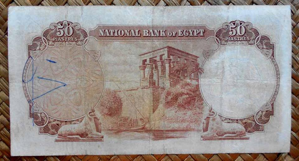 El billete de 50 piastras de Egipto de 1957 nos ofrece en el anverso a Tutankhamon y en el reverso el kiosko de Trajano (actualmente en la isla Agilkia) sobre dos carneros (simbolizando al dios Amón).
