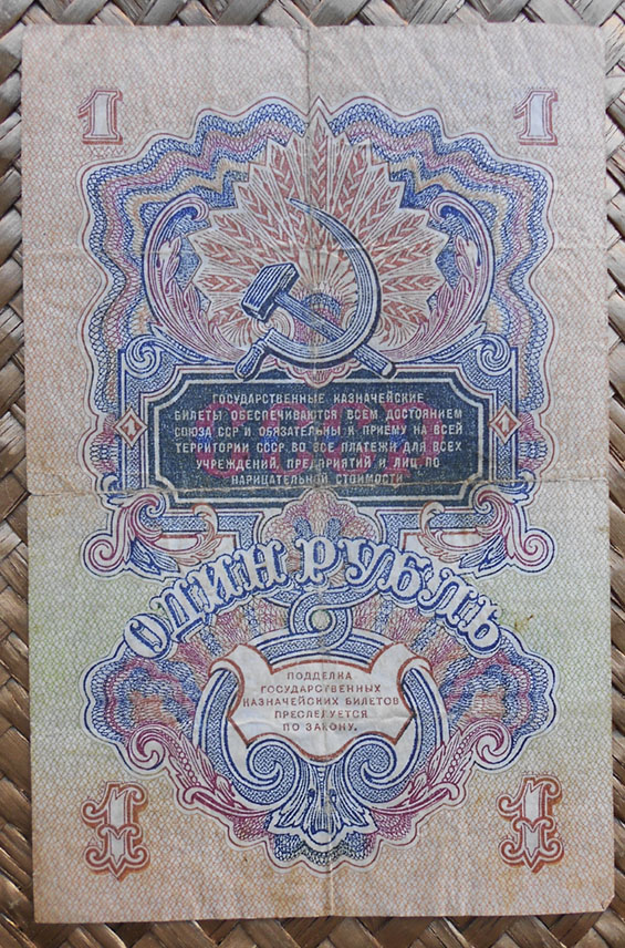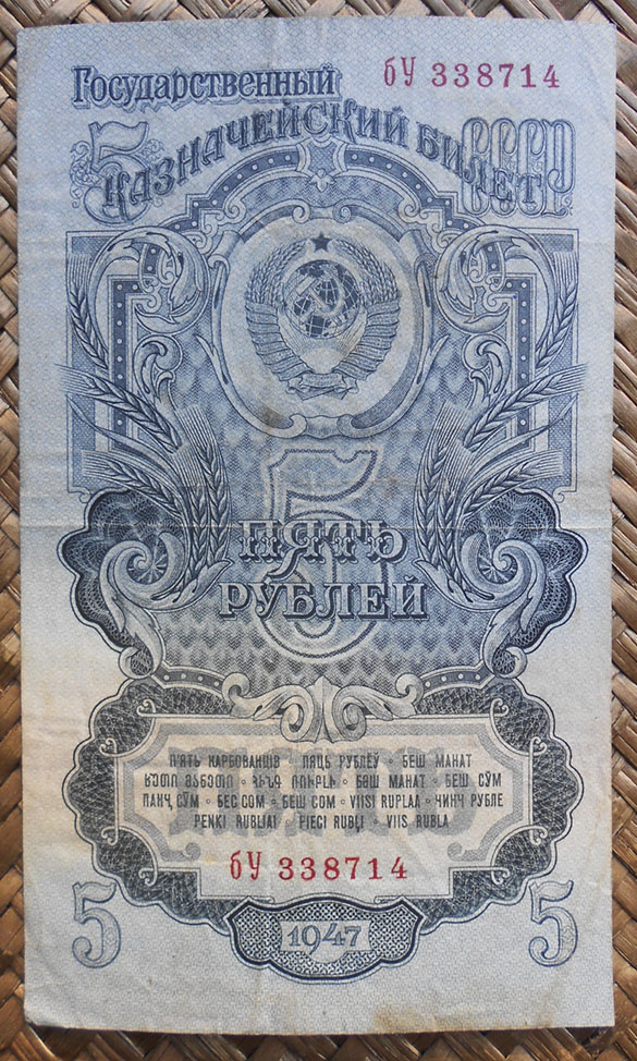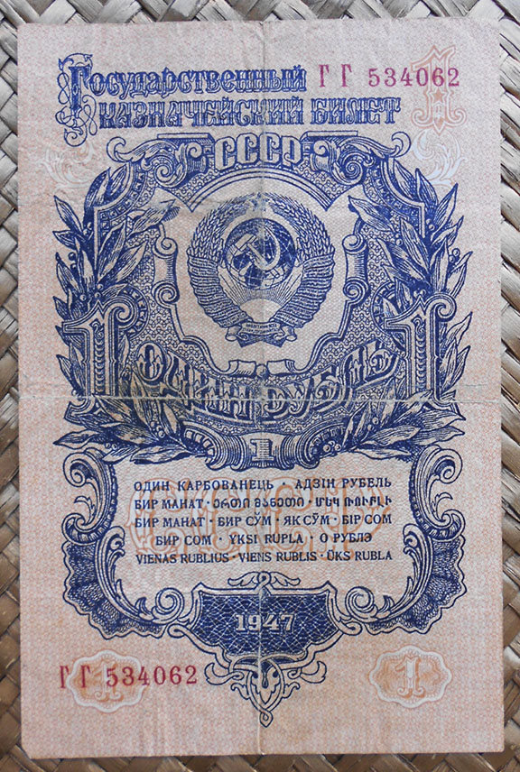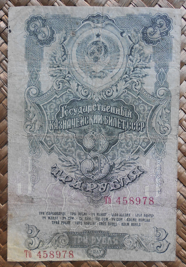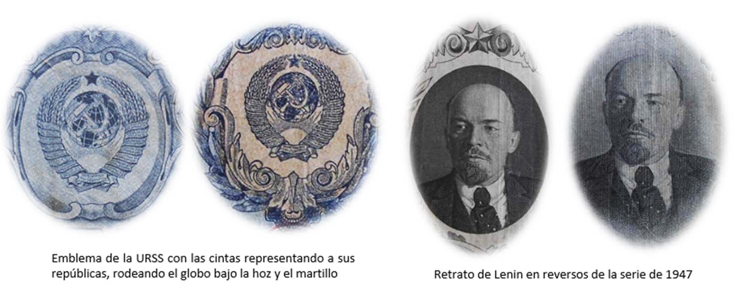 Los billetes de 1, 3 y 5 rublos de 1947 nos ofrecen extraordinarias composiciones en vertical, guilloches, marcos y rosetas con espigas, presididas por la hoz y el martillo sobre un globo terráqueo, rodeado de coronas de espigas (envueltas por cintas, una por cada república soviética al amparo de la URSS) y encabezadas por la estrella de cinco puntas.