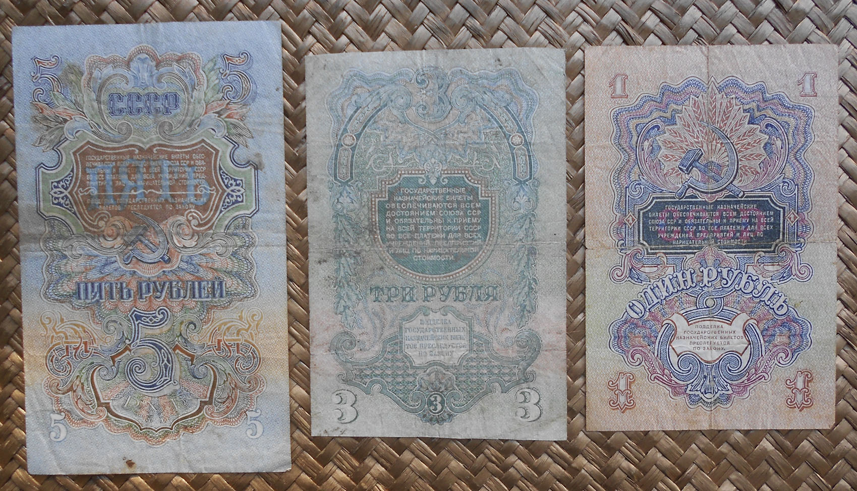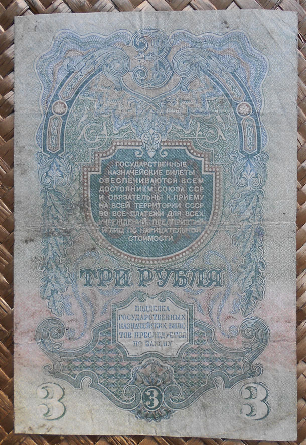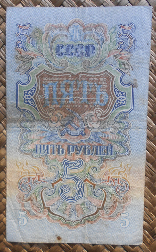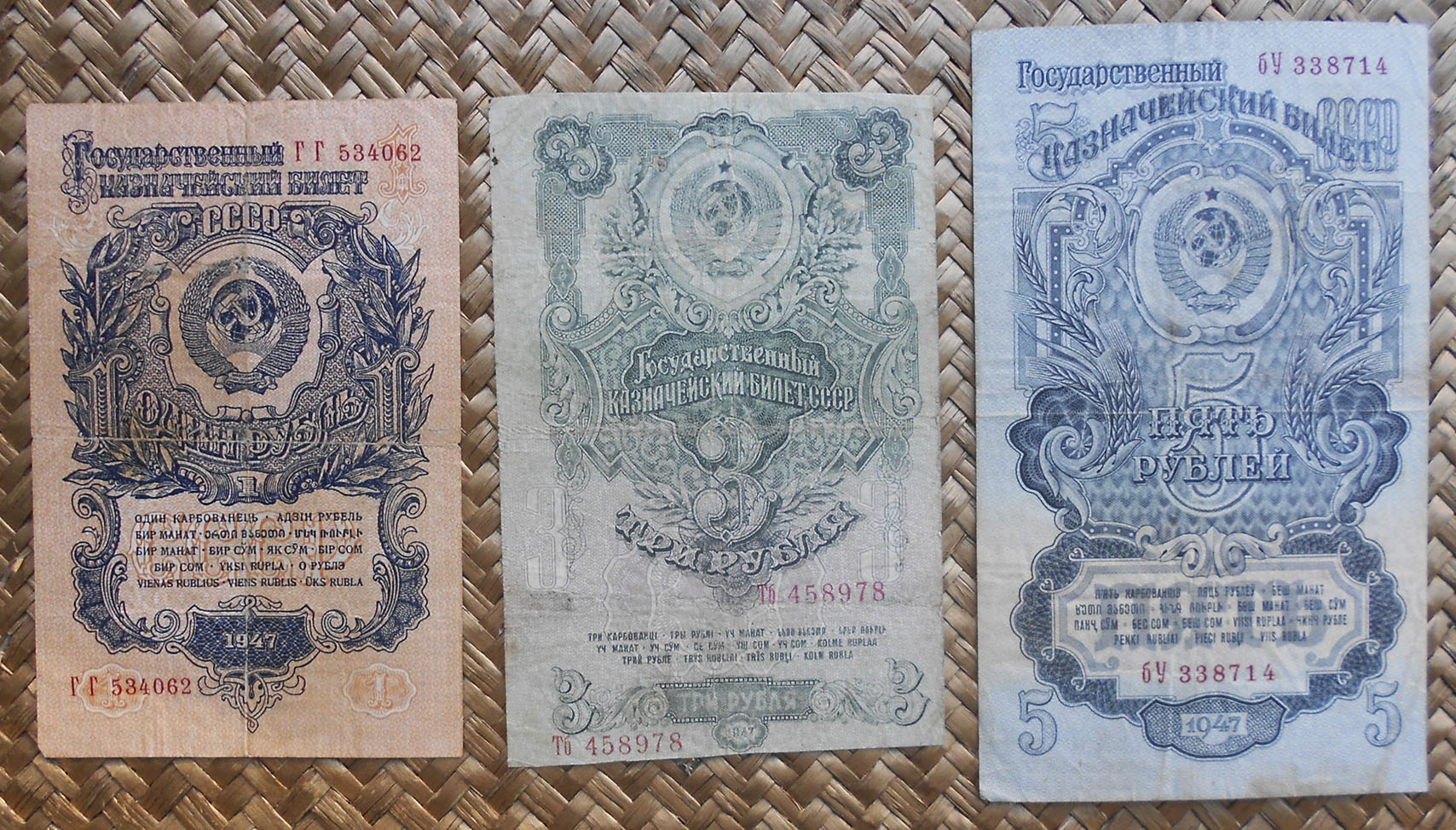 Los billetes de 1, 3 y 5 rublos de 1947 nos ofrecen extraordinarias composiciones en vertical, guilloches, marcos y rosetas con espigas, presididas por la hoz y el martillo sobre un globo terráqueo, rodeado de coronas de espigas (envueltas por cintas, una por cada república soviética al amparo de la URSS) y encabezadas por la estrella de cinco puntas.