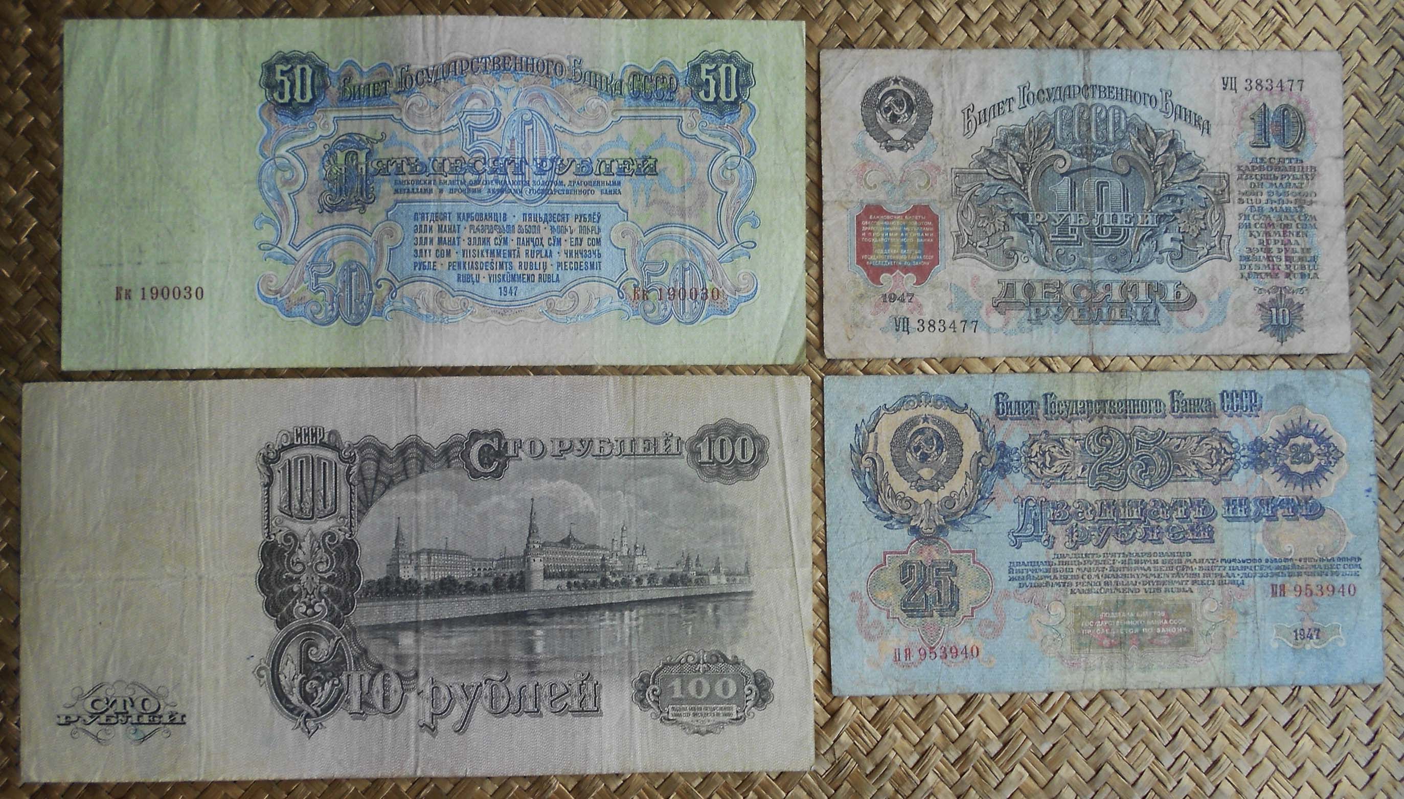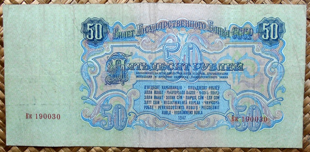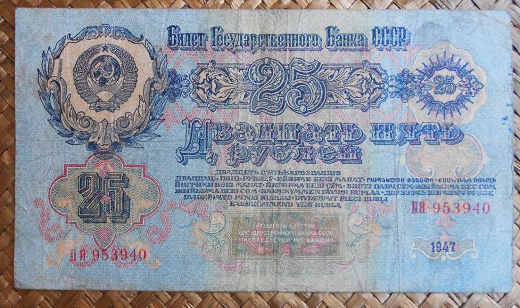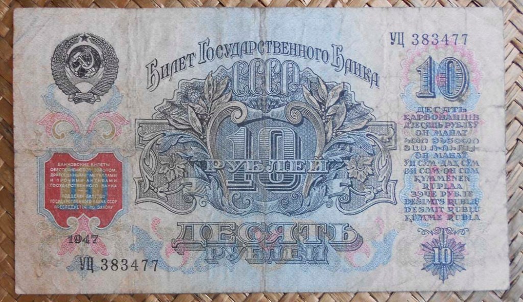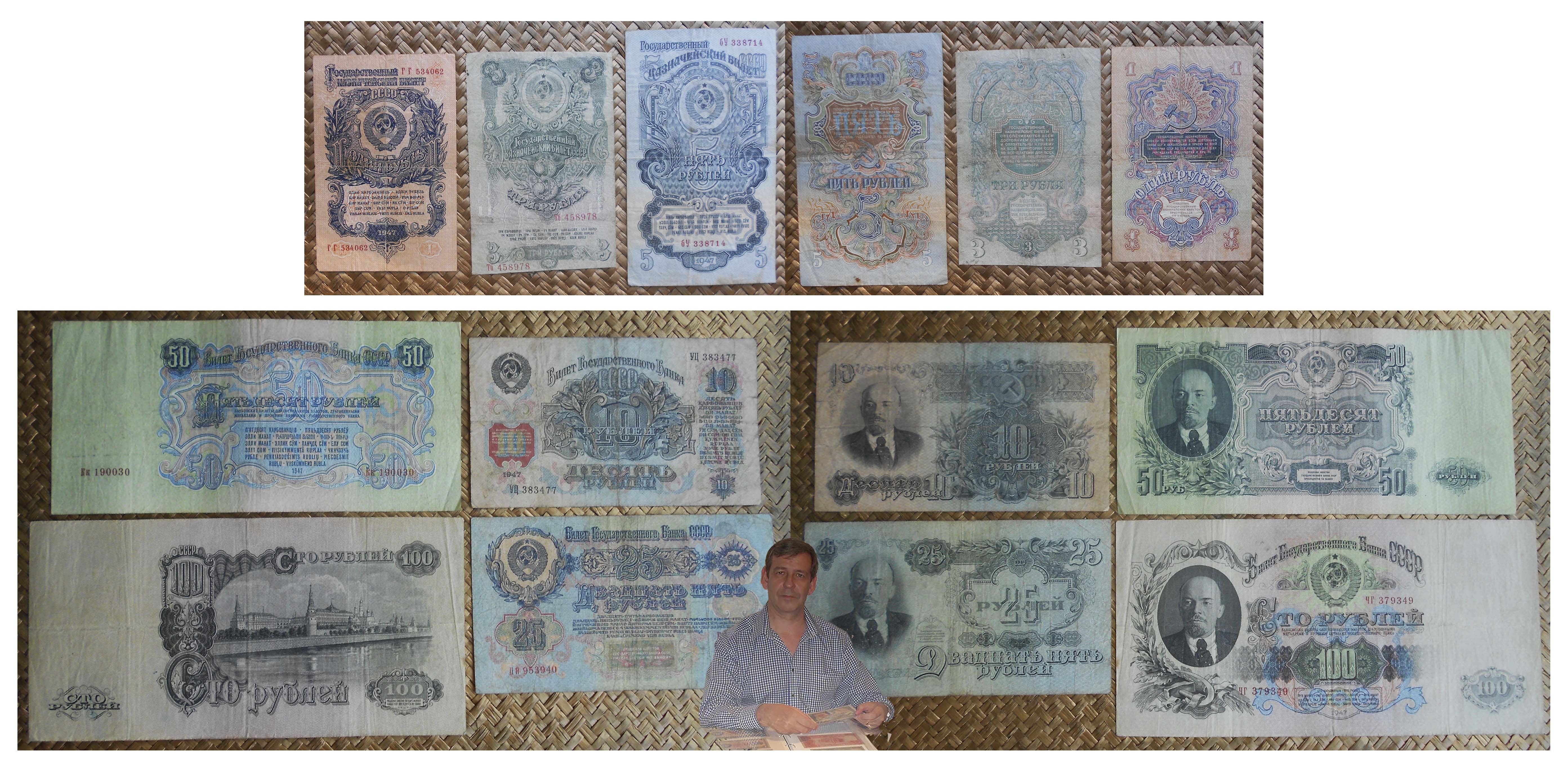 En 1947 se introdujeron los billetes del Tesoro Público de 1, 3 y 5 rublos, junto con los billetes del Banco del Estado de 10, 25, 50 y 100 rublos.
