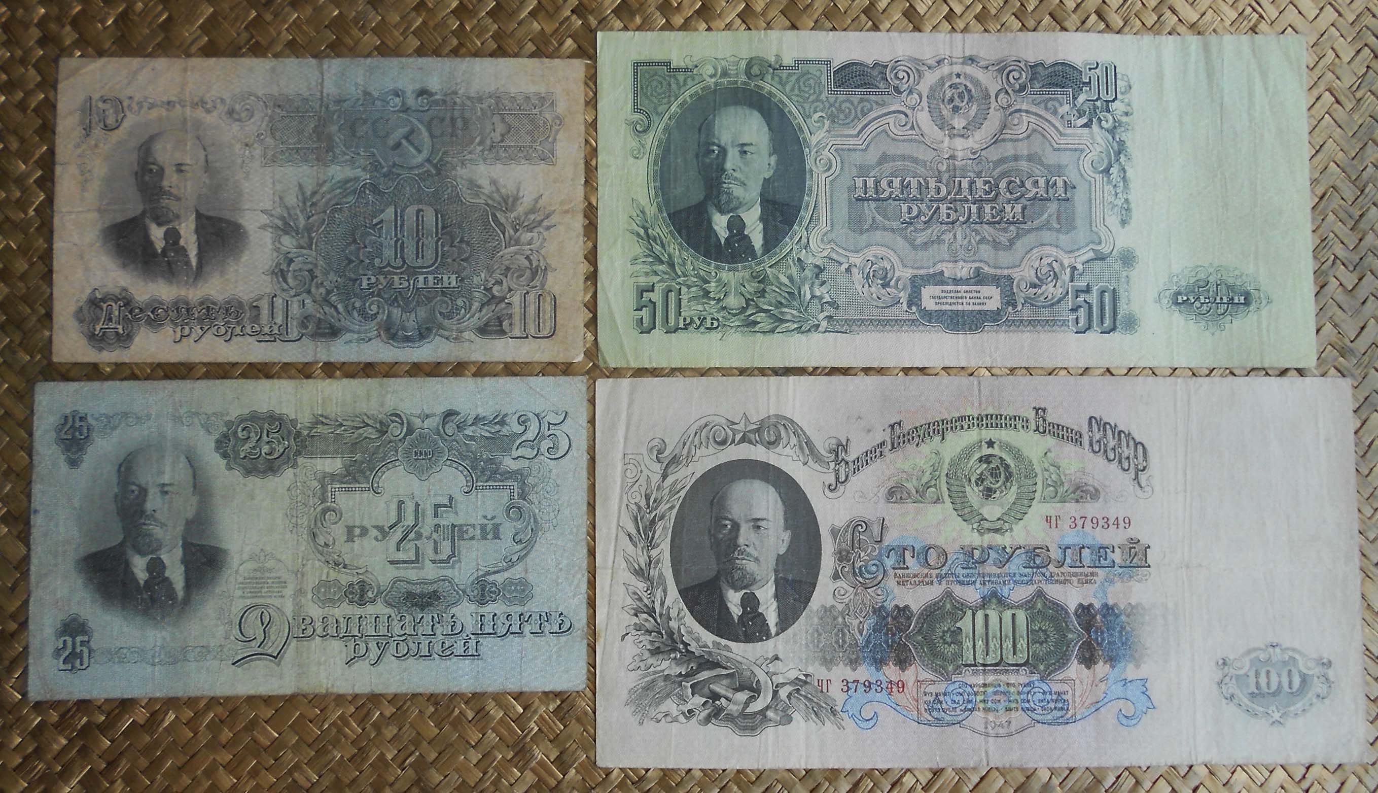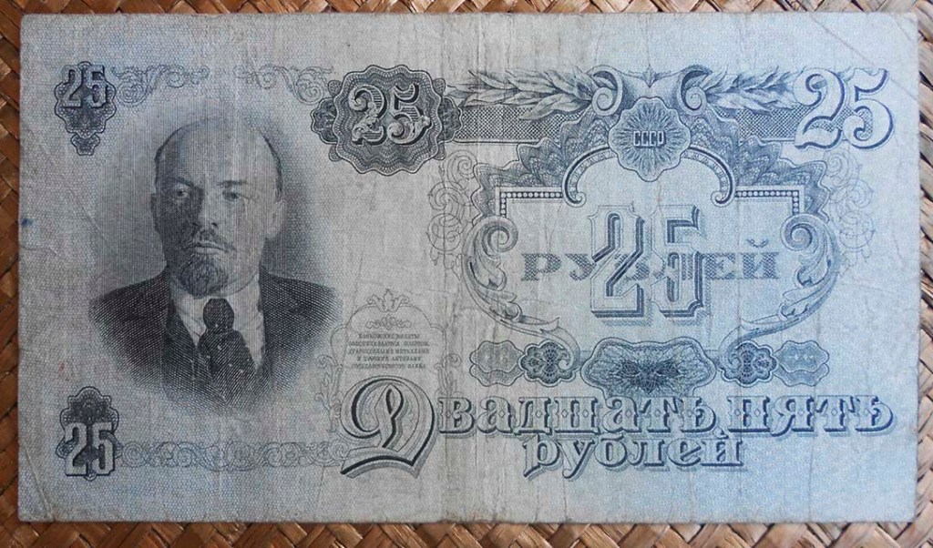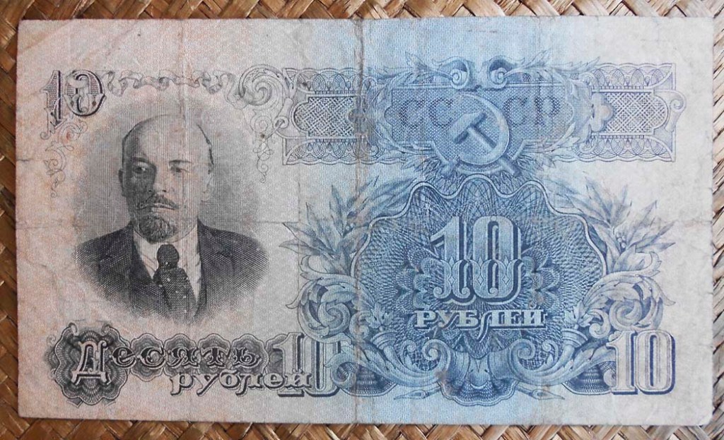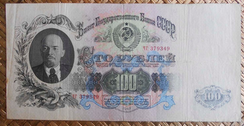 Los billetes de 10, 25, 50 y 100 rublos de 1947 nos muestran a Lenin simultaneando anversos y reversos, mientras que los lados opuestos ofrecen unos diseños florales muy artísticos entre sus cartuchos y bloques de texto, siempre (claro está) acompañados en alguna zona del mismo del símbolo soviético por excelencia: la hoz y el martillo sobre un globo terráqueo, rodeado de coronas de espigas y presidido por la estrella.
