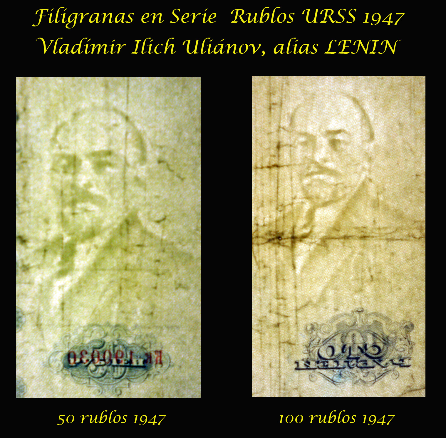 Y para cerrar esta peculiar serie, hablemos del personaje que ocupa su anverso o reverso, según valores. Vladímir Ilich Uliánov, alias Lenin (1870-1924) fue un revolucionario comunista que derrocó al zar Nicolás II durante la revolución bolchevique de octubre de 1917. Fue jefe de Estado desde 1917 hasta su muerte en 1924. Se le considera el responsable del asesinato de la familia del último zar ruso. El zar Nicolás II, su esposa la zarina Alexandra y sus cinco hijos – Olga, Tatiana, María, Anastasia y Alexei y su comitiva estaban planeando exiliarse cuando fueron asesinados a tiros en Ekaterimburgo el 17 de julio 1918 por el Ural Soviét, bajo las órdenes de Lenin y con el fin de evitar el rescate de la familia imperial por las fuerzas blancas leales al zar durante la Guerra Civil rusa. Lo veremos en los billetes de mayor valor y en las marcas de agua de los billetes de 50 y 100 rublos.